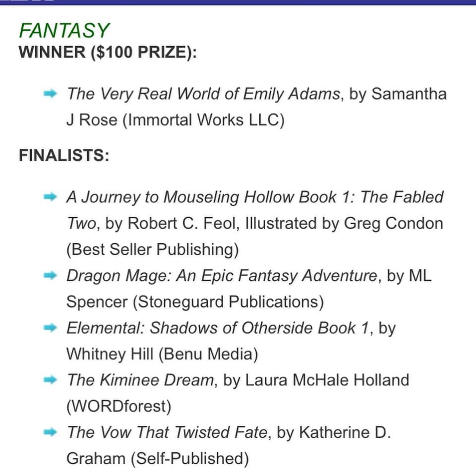 I clicked on the link and with the inner reassurance of “Well, at least you’re a finalist, that’s still good!” I scrolled through all the categories down to Fantasy.